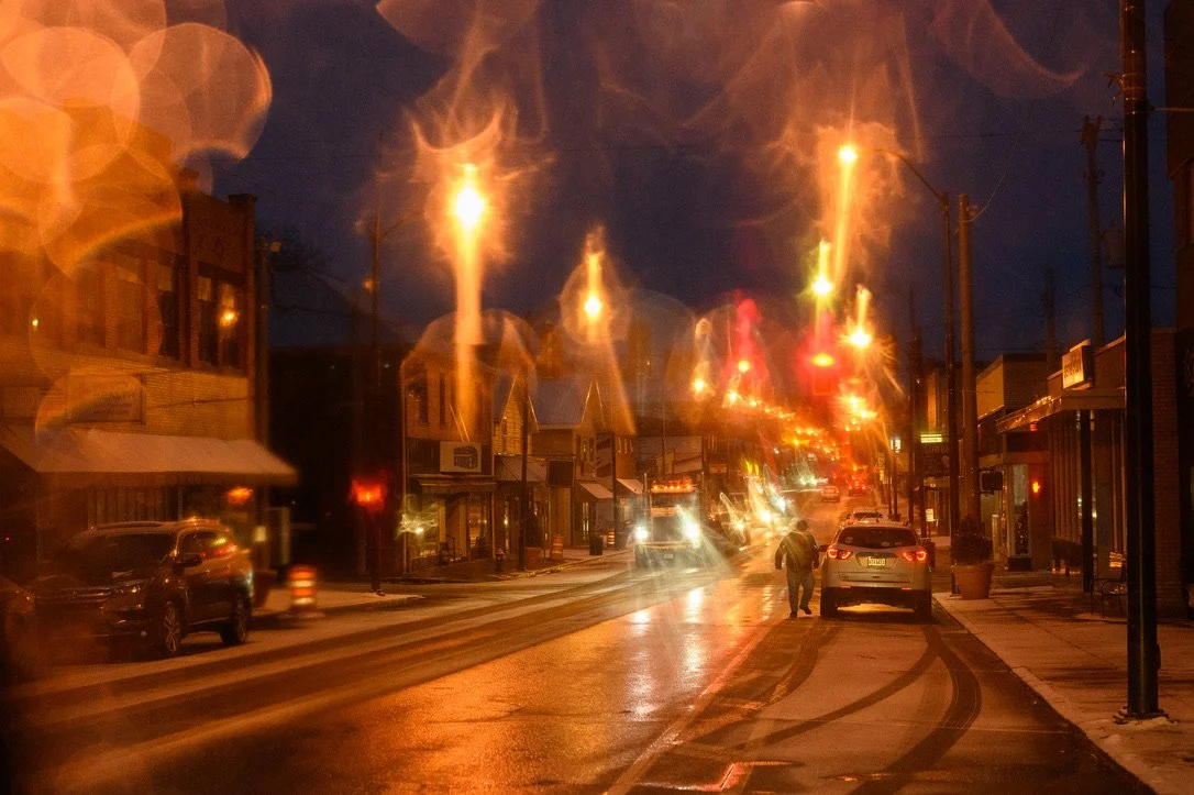 Snow falls along North Market Street as seen through the photographers windshield in East Palestine, Ohio on January 18, 2024.